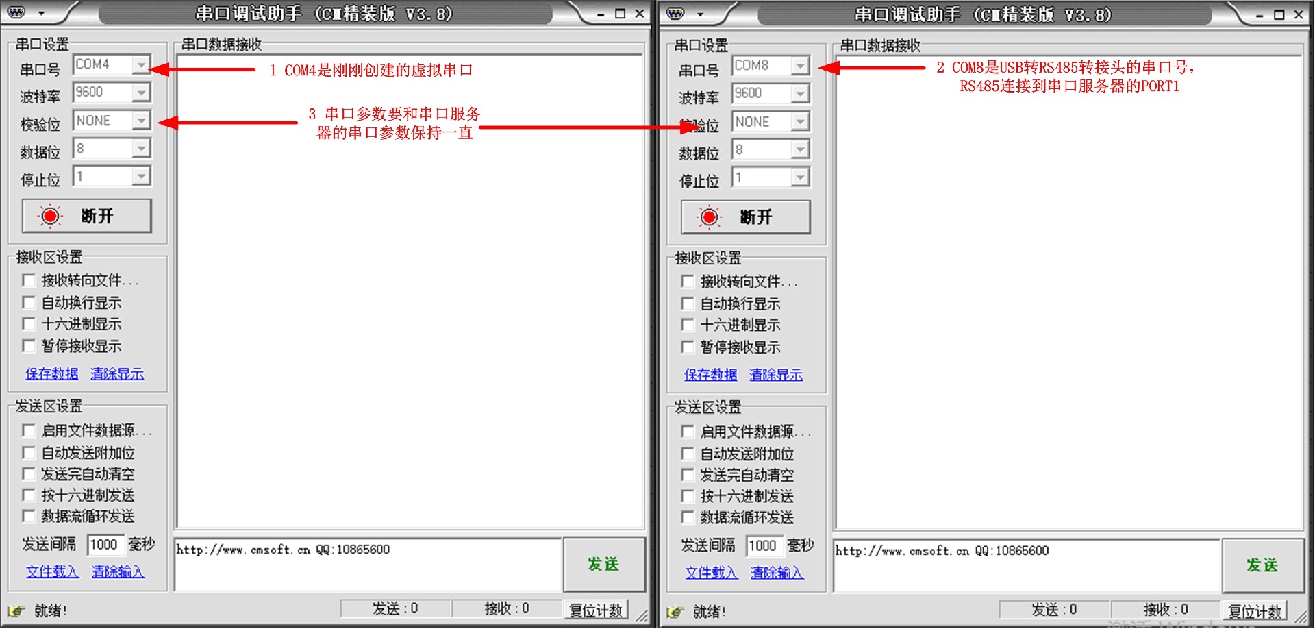 打开两个串口调试助手,一个串口调试助手连接虚拟串口COM4,另外一个串口调试助手连接串口服务器PORT1的对应串口号,如图13所示。配置完成之后,发送数据,如图14所示。