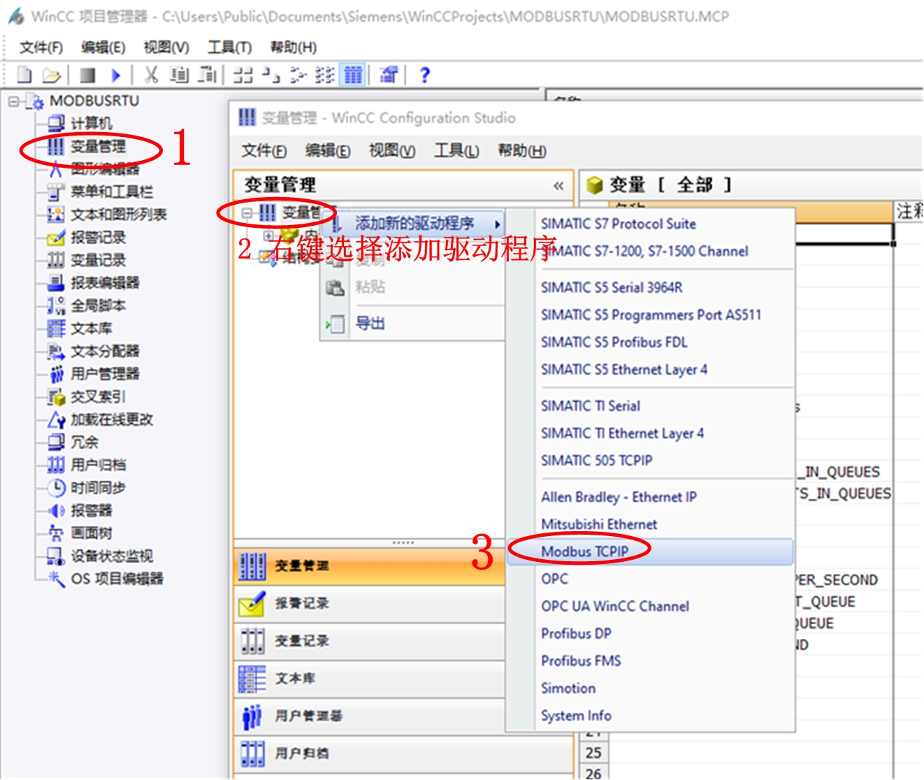 按图 所示步骤为工程添加“Modbus TCP/IP”的驱动程序。