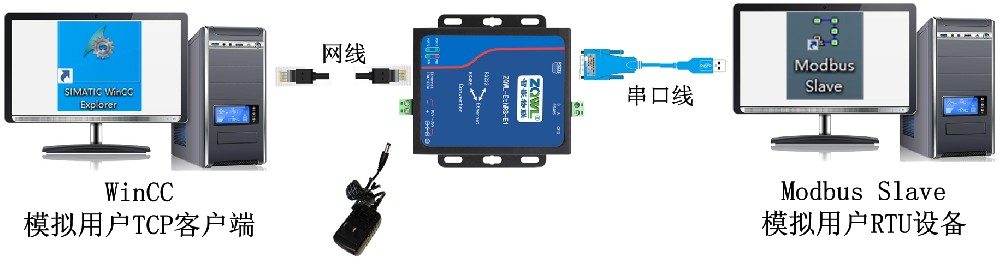 具体要实现的功能:ModBus Slave软件用来模拟用户的ModBus RTU设备(从站),西门子Win CC组态软件模拟用户的TCP客户端软件(主站),通过串口服务器设备实现西门子Win CC组态软件对ModBus RTU设备寄存器的访问。