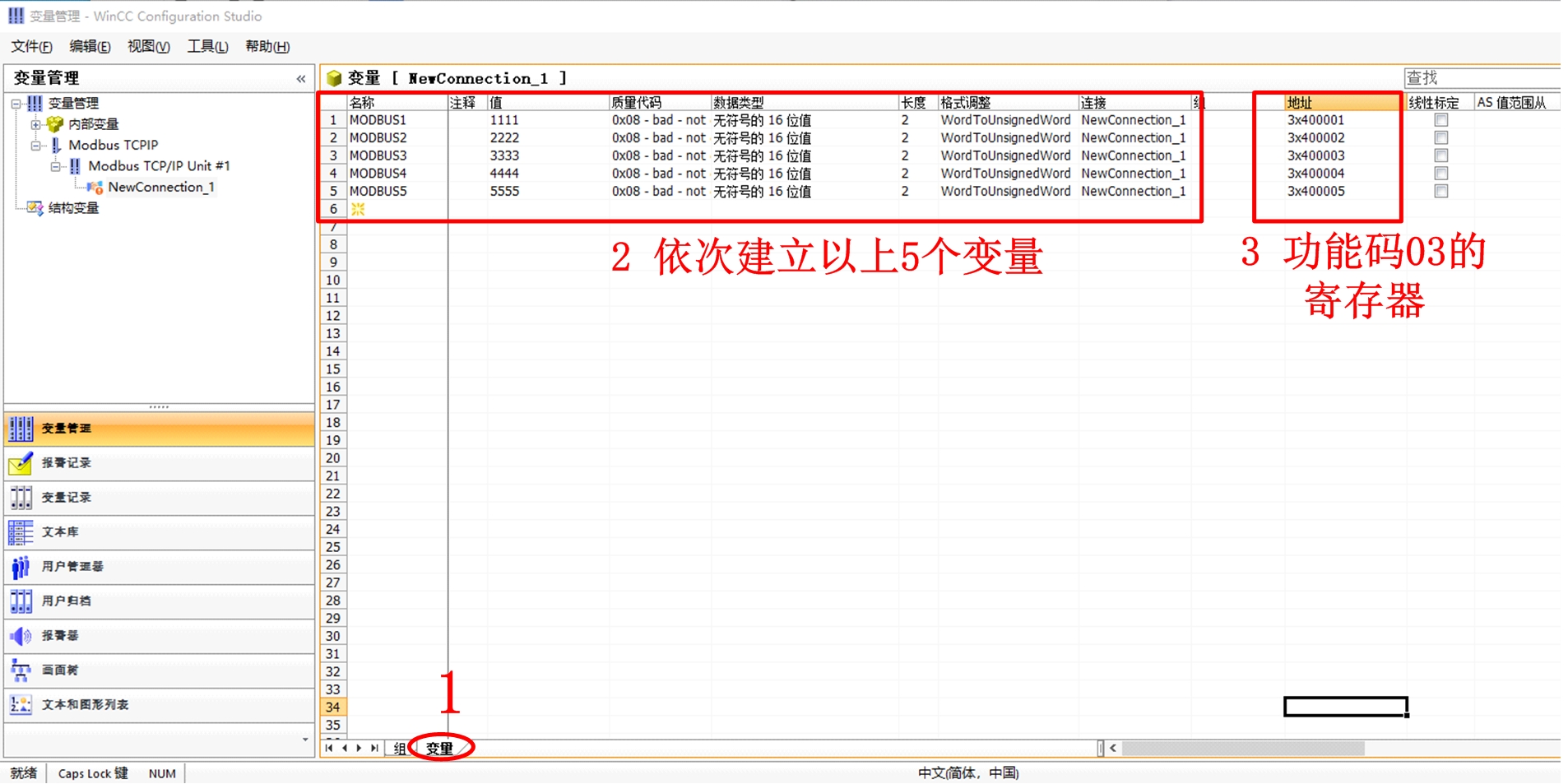 依次添加5个变量,分别代表Modbus Slave软件的5个寄存器值,如图 所示。