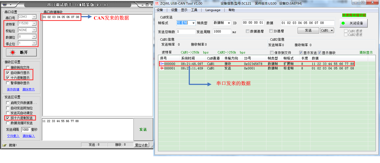 经过以上步骤后,CAN与RS232就可以互相发数据了。