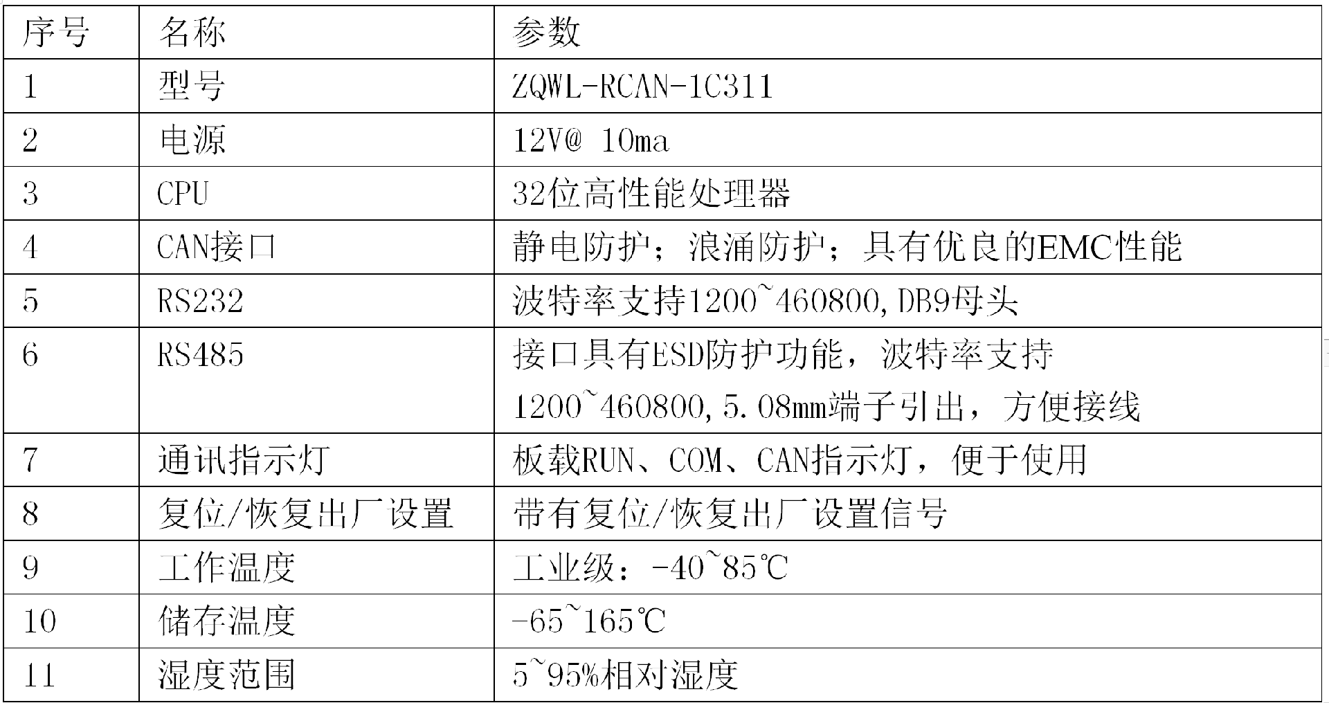 · 波特率支持10kbps~1000kbps。