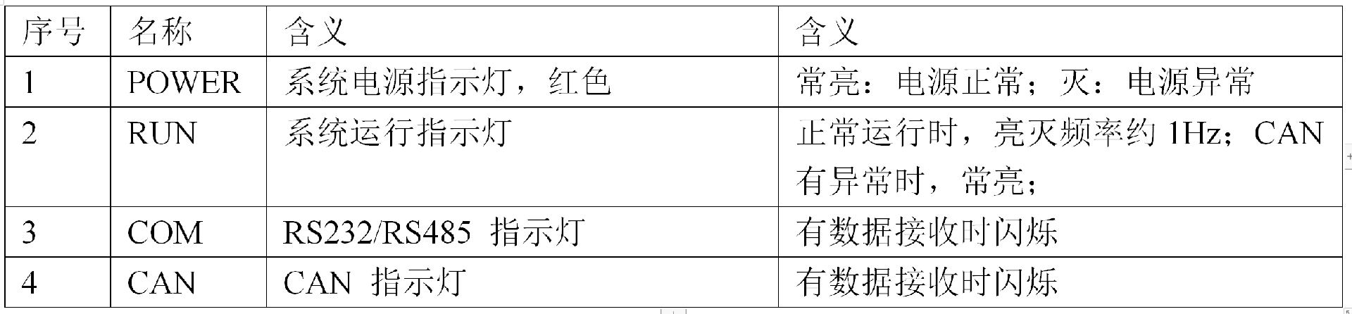 本模块共有4个LED指示灯:PWR、RUN、COM和CAN。其基本含义如表1: