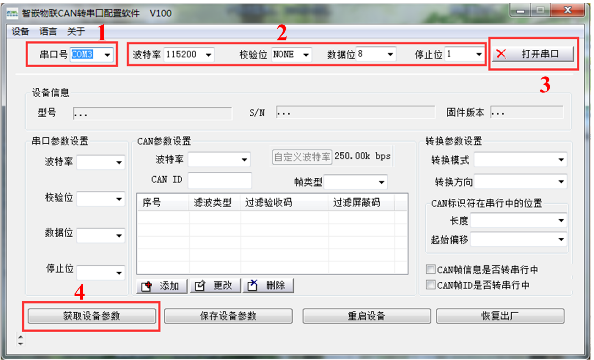 该部分可以设置转换器的CAN的波特率、CAN发送ID、帧类型以及CAN的滤波器。