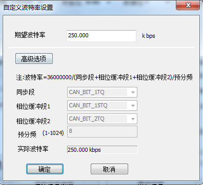 一般情况下,只需要在“期望波特率”里填写所需的波特率,软件就会自动计算出相应的参数(比如:预分频),这时会得到一个“实际波特率”,如果两者的值不同,可以打开“高级选项”: