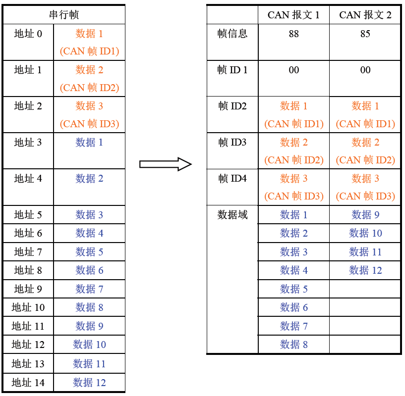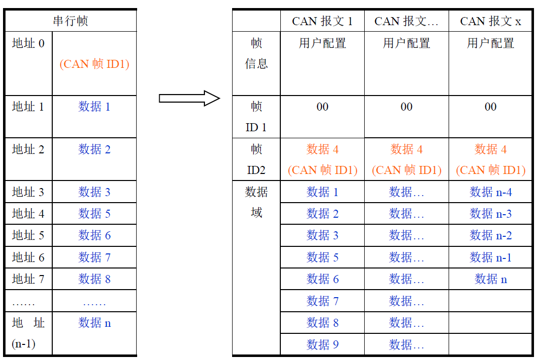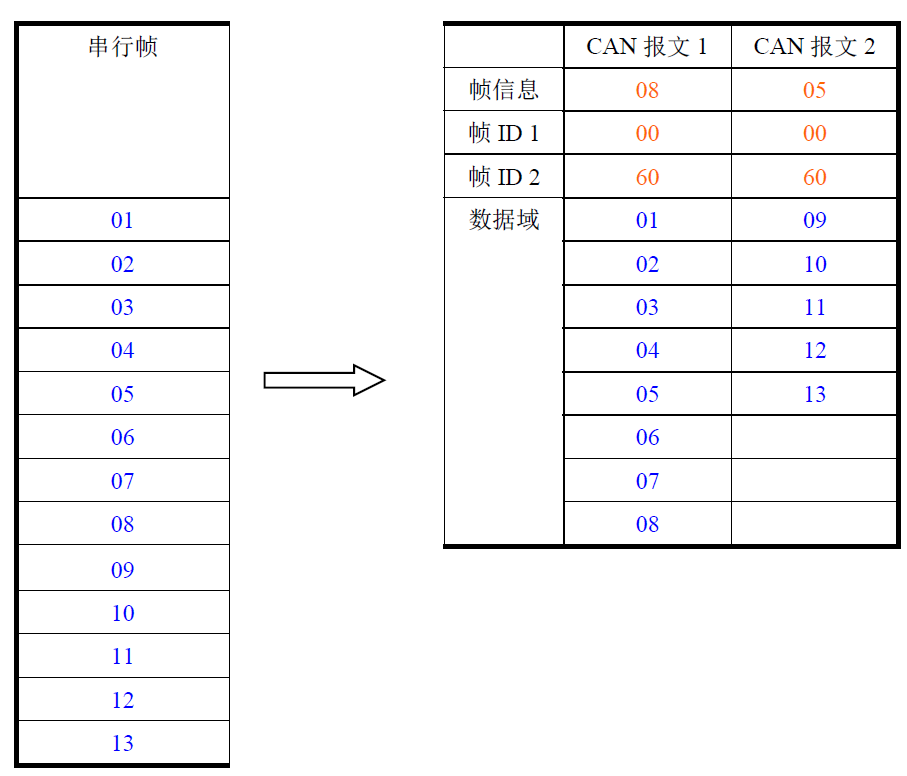 如果一帧CAN报文未将串行帧数据转换完,则仍然用相同的ID作为CAN报文的帧ID继续转换直到将串行帧转换完成。