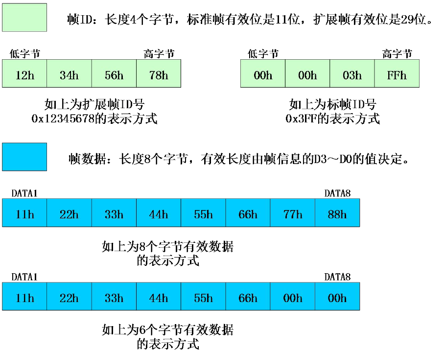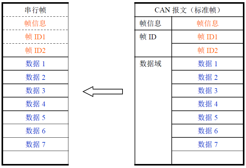 对于CAN总线的报文也是收到一帧就立即转发一帧。数据格式对应如下图所示。
