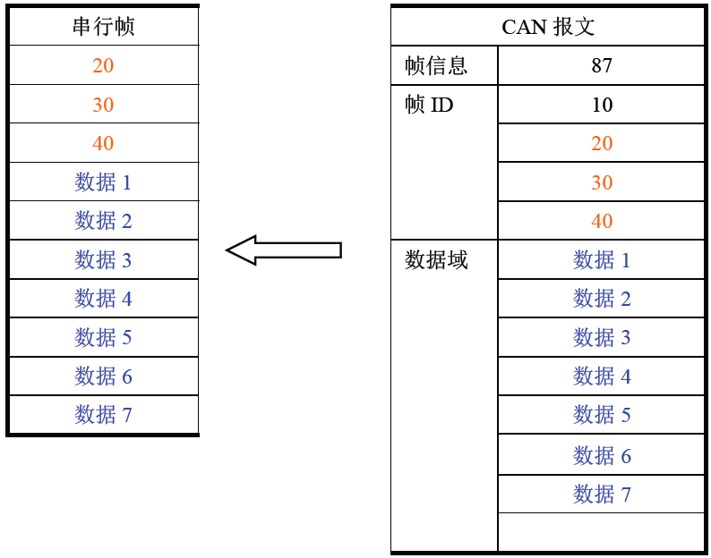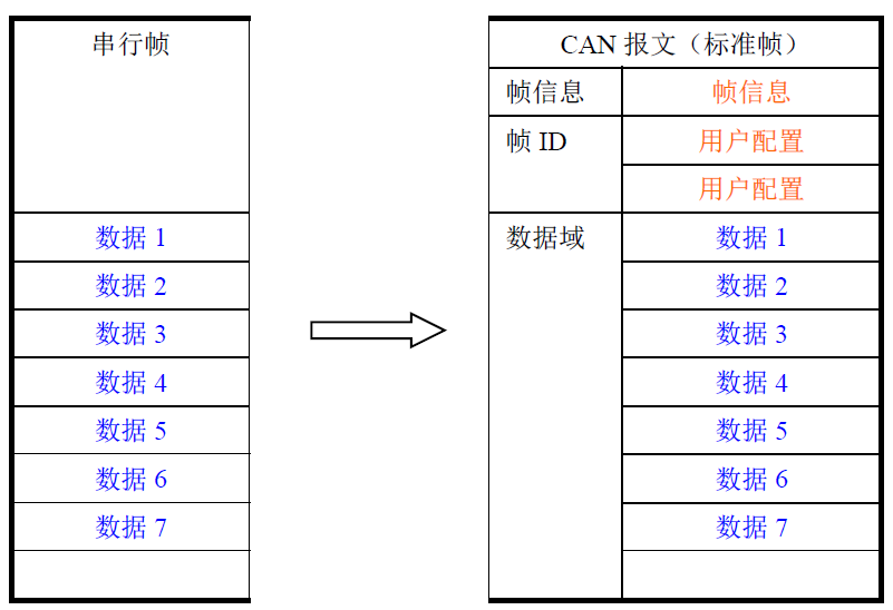 转换时将CAN报文数据域中的数据依序全部转换到串行帧中。