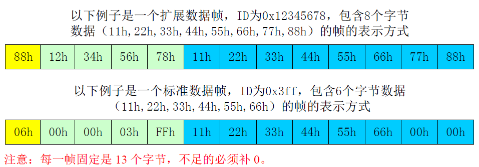 数据转换格式,如下图所示每一个CAN帧包含13个字节,13个字节内容包括CAN信息+ID+数据。