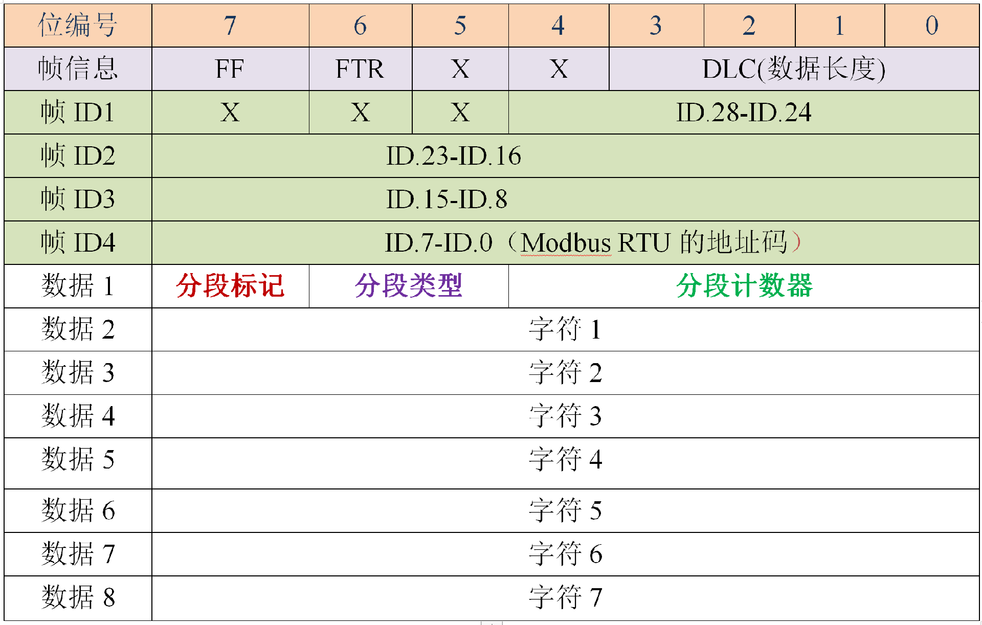 第一个字节01是Modbus RTU的地址码,转换成CAN的ID.7-ID.0;