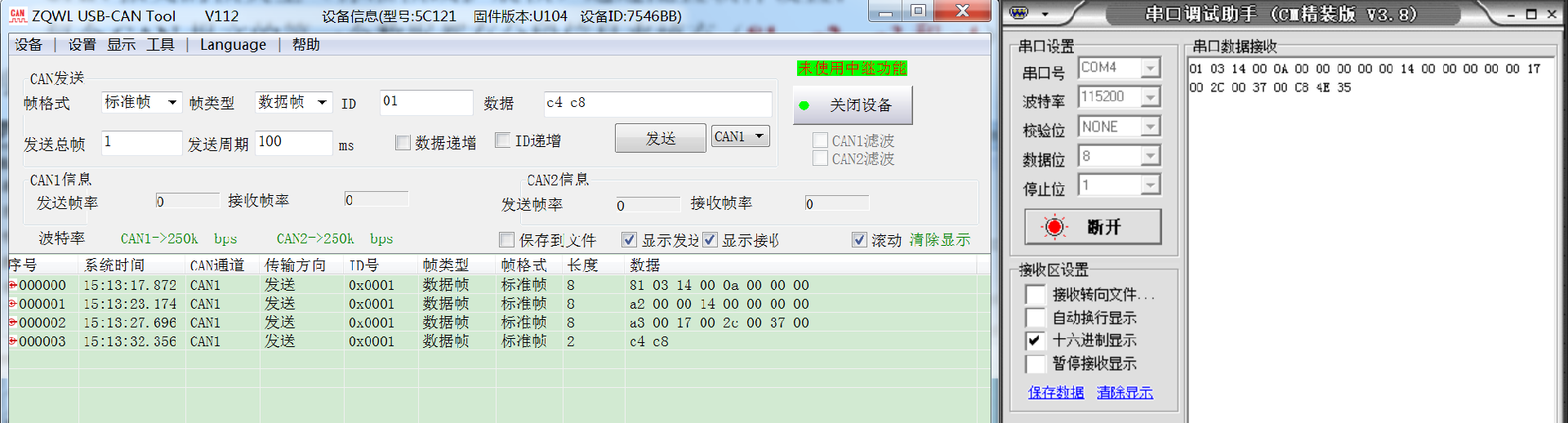 打开usb转can调试软件,设置好波特率为250kbps: